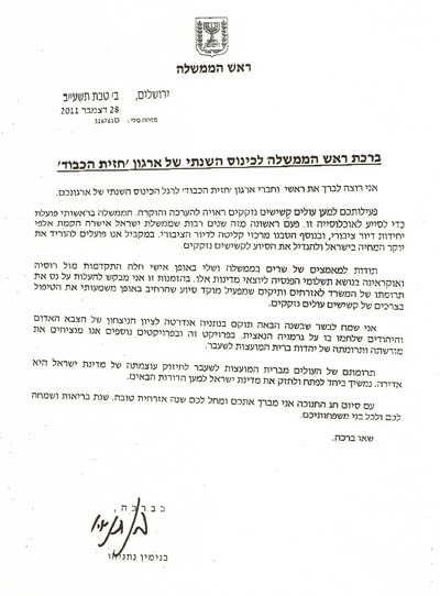 (перевод с оригинала на Иврите) Я хочу поприветствовать руководителей и членов движения "За достойное будущее" ("Хазит ха-Кавод") в честь ежегодного съезда вашего движения.Ваша деятельность во благо нуждающихся репатриантов пенсионеров заслуживает признательности и уважения. Правительство во главе со мной прилагает усилия, чтобы оказать им помощь. Впервые за много лет, это правительство утвердило строительство тысяч единиц социального жилья. Также, центры абсорбции были преобразованы в социальное жилье. Параллельно, мы добиваемся снижения дороговизны жизни в Израиле и увеличения помощи нуждающимся пожилым людям. Благодаря усилиям министров правительства и моим лично, был достигнут прогресс в вопросе о выплате пенсий выходцам из России и Украины. Пользуясь случаем, хочу похвалить работу министерства по делам пенсионеров и его центра помощи, работа которого значительно расширила помощь пожилым нуждающимся репатриантам. Я рад сообщить вам, что в следующем году будет основан в Нетании Мемориал в честь победы Красной армии и евреев, воевавших в ее рядах. В рамках этого и многих других проектов, мы увековечиваем историю, наследие и вклад советского еврейства. Вклад репатриантов из стран бывшего Советского Союза а укрепление мощи государства Израиль - огромен. Мы вместе продолжим развивать и укреплять государство Израиль ради будущих поколений. В завершение праздника Хануки я вас поздравляю и желаю вам счастливого Нового года. Здоровья и радости вам и вашим семьям в предстоящем году. Всех вам благ, Биньямин Нетаниягу Премьер-министр Израиля
